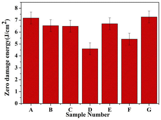 The laser-induced damage threshold (LIDT) of the samples was evaluated using small-beam 1-on-1 testing in a laser damage test facility with a triple-frequency Nd-YAG laser. The wavelength, pulse width, and laser repetition rate were 355 nm, 9.3 ns (FWHM), and 1 Hz, respectively. During the test, we randomly selected ten points on the surface of the samples, and each point was exposed to the same energy of the laser beam. We then calculated the damage probability density with the zero-probability damage threshold. The statistics for the zero-probability damage threshold are shown in Figure 7. The results indicate that different etching processes enhance the laser damage resistance performance differently. The zero-probability damage thresholds of samples A and G are significantly higher than those of the other samples, which is consistent with our characterization of the surface and sub-surface defects of the samples. It has been shown that RIE etching can effectively remove surface/subsurface defects from quartz crystal elements. When a reasonable etching process is used, the introduction of impurities can be effectively avoided without causing secondary defects and contamination to the sample. In addition, it is shown that there is a positive correlation between the damage precursor detection and characterisation results and the damage threshold, and the damage precursor detection technique based on quartz crystals can well evaluate and predict the damage performance of the samples, and it can be analogous to the process of the damage performance study of fused silica, which can provide mutual corroboration of the damage precursor detection of fused silica.