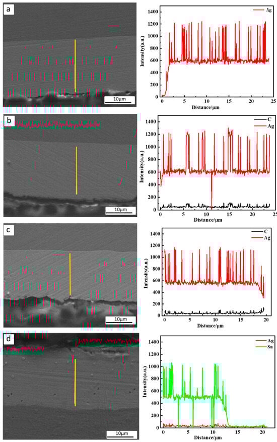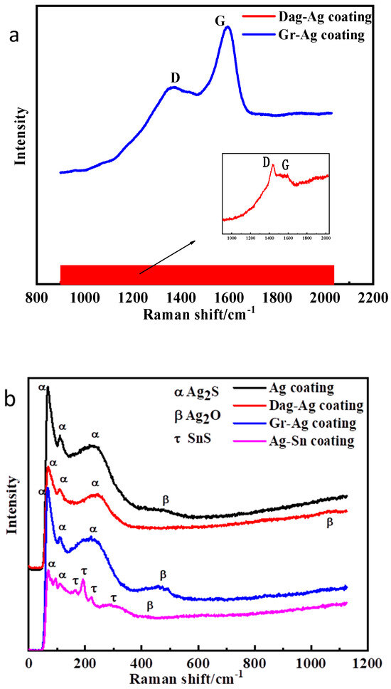 - Ag, Sn, and graphite had good dispersibility in the four coatings, as shown by the cross-section morphology. After the immersion test, the corrosion products on the surface of the four coatings had silver sulfide and silver oxide, as shown by Raman analysis.