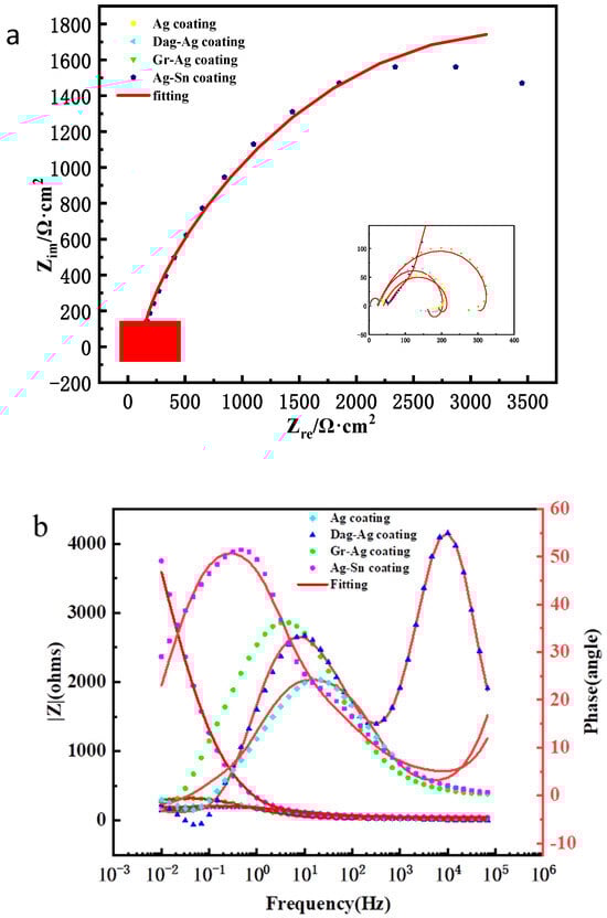 - Through the electrochemical and immersion tests, statistically, it was found that the corrosion resistance of the four coating samples was sorted as follows: the corrosion resistance of the Ag-Sn coating was higher than that of the Gr-Ag coating, which was higher than that of the Ag coating, and the G-Ag coating had the worst corrosion resistance. The Gr-Ag coating and Sn-Ag coating are better choices than the Ag coating.