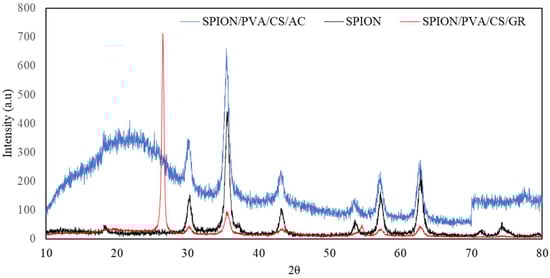 Overlay XRD diffractograms of SPION, SPION/PVA/CS/AC, and SPION/PVA/CS/GR.