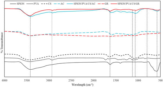 FTIR analysis of SPION, PVA, CS, AC, GR, SPION/PVA/CS/AC, and SPION/PVA/CS/GR.