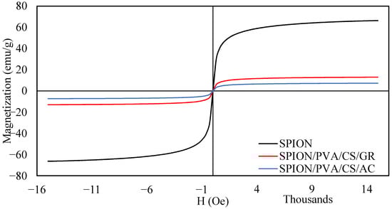 The magnetic characteristics of SPION, SPION/PVA/CS/AC, and SPION/PVA/CS/GR were carried out by VSM analysis at room temperature, which can be obtained by the S-shaped curves among the magnetic field without coercivity of remanence. As a result, in Figure 5, VSM analysis proves that the IONPs were superparamagnetic [].