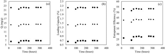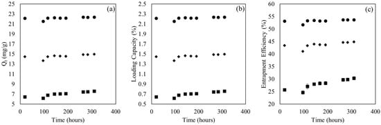 The same pattern can be observed with entrapment efficiency, which is provided in Figure 8, with the maximum of %EE obtained after 265 h. Specifically, the %EE of each concentration was 27.949%, 43.543%, and 53.393%, respectively. The further experimental time span led to a drop in %EE after the adsorption had reached equilibrium.
