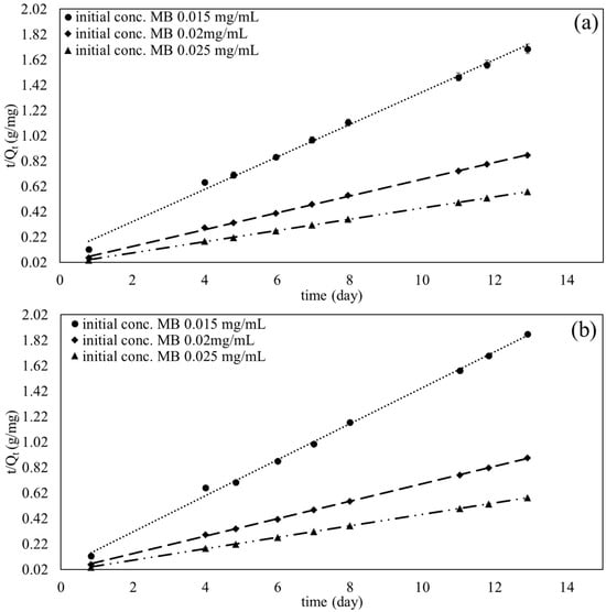 Pseudo-second-order model of (a) SPION/PVA/CS/AC and (b) SPION/PVA/CS/GR adsorbing methylene blue.