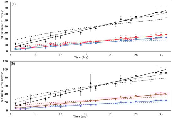 From the adsorption experiments, adsorption capacities (Qt), loading capacity (%LC), entrapment efficiency (%EE), adsorption kinetics (pseudo-first order linear/non-linear, pseudo-second order linear/non-linear, simplified Elovich), intraparticle diffusion, and adsorption isotherms (Langmuir and Freundlich) were calculated. The desorption experiments can be used to illustrate the desorption kinetics (Korsmeyer–Peppas, Higuchi, and zeroth order). These mentioned parameters and various others can be calculated using equations that were published previously [,,].