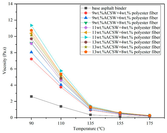 The Brookfield rotational viscosity test results of the modified asphalt binders under different temperatures are shown in Figure 2. The viscosity values of all the APMAs sharply decreased with the increase in test temperatures, which demonstrated that the APMAs had temperature-dependent properties. In detail, when the temperatures were changed from 90 °C to 135 °C, the viscosity values of the modified asphalt binders sharply reduced, and, when the temperatures were higher than 135 °C, the viscosity values of the modified asphalt binders slowly decreased. The reason for this might be that, as the temperature rises, the state of the asphalt binder changes from visco-elasticity to visco-plasticity, and the internal molecules and the frictional force gradually decline between the asphalt binder and ACSW-polyester fiber composite.