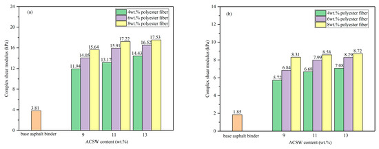 The influence of the ACSW and polyester fiber on the rheological performance of asphalt binder was analyzed using a complex shear modulus (G*) and phase angle (δ), and the results of the DSR test are shown in Figure 3 and Figure 4.