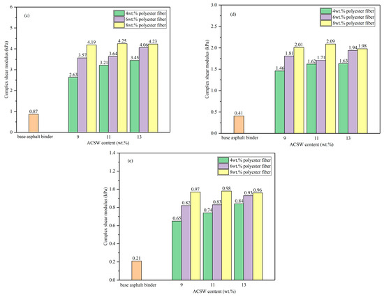 The G* values of the APMAs reached their maximum value with 11 wt.% ACSW and 8 wt.% polyester fiber under different temperatures; namely, when the temperatures were 58, 64, 70, 76, and 82 °C, the maximum values of G* for the APMAs were 17.53 kPa (13 wt.% ACSW and 8 wt.% polyester fiber), 8.72 kPa (13 wt.% ACSW and 8 wt.% polyester fiber), 4.25 kPa (11 wt.% ACSW and 8 wt.% polyester fiber), 2.09 kPa (11 wt.% ACSW and 8 wt.% polyester fiber), and 0.98 kPa (11 wt.% ACSW and 8 wt.% polyester fiber). The results showed that the G* values of the APMAs sharply declined as the temperature increased and also proved that the modified asphalt binder had a significant temperature sensitivity.