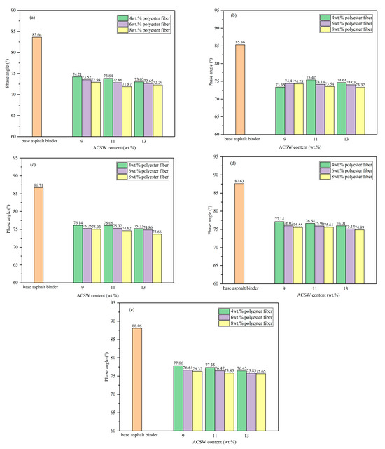 Figure 4 implies that the δ values of all the APMAs become larger as the temperature rises. The results evaluated that raising the temperature would enhance the fluidity of the asphalt binder. At the same temperature, the δ values of the asphalt binders decreased, at first, after adding the ACSW and polyester fiber and then, with the ACSW contents (or polyester fiber contents) becoming larger, the δ values of all the APMAs were reduced. Taking the 11 wt.% ACSW and 8 wt.% polyester fiber-compound-modified asphalt binder as an example for analysis, when the temperatures were 58, 64, 70, 76, and 82 °C, the δ values of the asphalt binders were 71.87°, 73.54°, 74.62°, 75.61°, and 75.85°, while, in comparison to the base asphalt binder, the δ values of the asphalt binders decreased by 14.07%, 13.85%, 13.94%, 13.72%, and 13.86%.