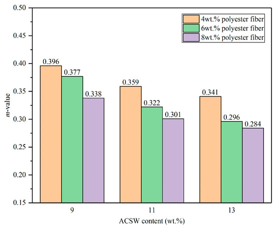 It can be seen from Figure 7 that the m-value of the asphalt binder was reduced after adding the ACSW and polyester fiber. At the same content level of ACSW (or polyester fiber), the m-value of the APMAs gradually decreased with the increasing in the contents of polyester fiber (or ACSW). When the contents of ACSW were not higher than 11 wt.%, the m-value of all the APMAs was larger than 0.3; meanwhile, when the content of ACSW was 13 wt.%, the m-value of the APMA was 0.296, and it was 0.284 under 6 wt.% and 8 wt.% polyester fiber, respectively. Compared to the base asphalt binder (0.448 m-value), the m-value of the asphalt binder modified with 13 wt.% ACSW and 6 wt.% polyester fiber or 13 wt.% ACSW and 8 wt.% polyester fiber was decreased by 33.93% and 36.61%. This result suggested that adding the ACSW and polyester fiber reduced the low-temperature performance of the asphalt binder, possibly because the ACSW and polyester fiber declined the stress scatter and disappear energy of the asphalt binder at low temperatures.