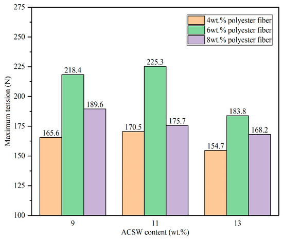 The maximum tension represented the tensile cohesive failure strength of the asphalt binder when it entered the yield stage. The larger the value of maximum tension, the greater the low-temperature characteristic of the APMA. From Figure 8, the maximum tension values of the asphalt binder sharply increased with the addition of the ACSW and polyester fiber. The results indicated that the tensile force required for the asphalt binder to enter the yield stage increased after adding the ACSW and polyester fiber; namely, the ACSW and polyester fiber could enhance the low-temperature ability of the asphalt binder. Under the same contents of ACSW, the maximum tension values of the APMAs first increased and then decreased by increasing the contents of polyester fiber. When the dosage levels of the polyester fiber were 4 wt.% and 6 wt.%, respectively, the maximum tension values of the APMAs were, first, gradually enhanced and then decreased by increasing the dosage of ACSW, and, when the dosage level of the polyester fiber was 8 wt.%, the maximum tension values of the APMAs became lower by increasing the dosage of ACSW. After adding 11 wt.% ACSW and 6 wt.% polyester fiber, the maximum tension of the APMA reached its maximum value (225.3 N) and was 3.1 times larger than that of the base asphalt binder (55.4 N). This result implied that adding the ACSW and polyester fiber greatly enhanced the tensile cohesive failure strength of the asphalt binder, possibly because the ACSW and polyester fiber provided a three-dimensional interwoven mesh structure within the asphalt binder structure [15,33].