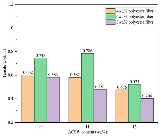 The tensile work comprehensively considered the change of tensile force and elongation during the force ductility test. The larger the value of tensile work, the greater the low-temperature ductility of the APMA. From Figure 9, the values of the tensile work of the APMAs were larger than that of the base asphalt binder (0.130 J). When the dosage levels of the ACSW were constant, the tensile work values of the asphalt binder increased at first and then decreased by increasing the content of polyester fiber. After mixing with 6 wt.% polyester fiber, the tensile work value of the asphalt binder was gradually larger at first and then lower with the increased dosage of ACSW, and, when the dosage level of the polyester fiber was 4 wt.% and 8 wt.%, respectively, the tensile work value of the APMAs became lower by increasing the dosage of ACSW. After adding 11 wt.% ACSW and 6 wt.% polyester fiber, the tensile work of the APMA reached its maximum value (0.786 J), and it was 5.05 times greater than that of the base asphalt binder (0.130 J). This result suggested that adding the ACSW and polyester fiber greatly improved the low-temperature tensile work for the asphalt binder. The reason behind this might be that the fiber-modified asphalt binder would be considered as a fiber-composite-reinforced material with asphalt binder as the matrix. The fiber produced a marked effect in strengthening the asphalt binder structure through “adsorption” and “interlacing” behaviors. During the tensile process of the fiber-modified asphalt binder, the three-dimensional, randomly distributed fibers inside the structure consumed the tensile stress and gradually shifted in the direction of the tensile force. At the same time, the interface friction between the asphalt binder and the fibers prevented the asphalt binder from moving along the tensile direction. Therefore, when the contents of ACSW and polyester fiber were appropriate, they gave full play to the above-described strengthening effect in the asphalt binder. However, when the contents of ACSW and polyester fiber were excessive, an effective interface layer could not be formed between the asphalt binder and the surface of the ACSW and polyester fiber and the ASCW and polyester fiber were made to easily aggregate in the asphalt binder. The reduction in the maximum tension and tensile work of the APMA led to weak areas with defects appearing in the asphalt binder.