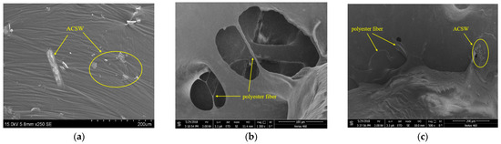 SEM images of the AMPAs. (a) ACSW-modified asphalt; (b) polyester fiber-modified asphalt; and (c) AMPA.