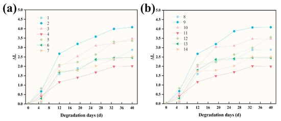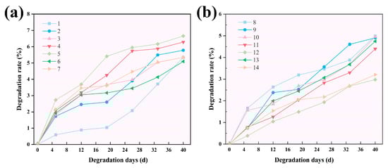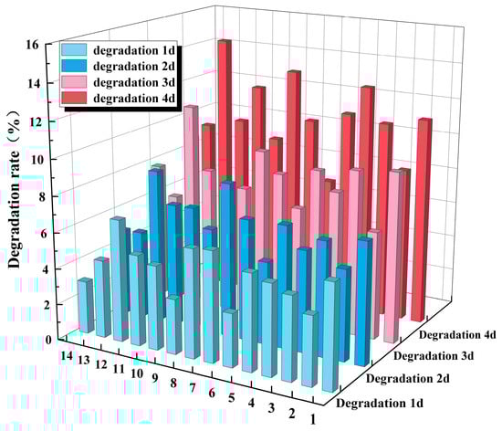 From Figure 12, it can be seen that the degradation rate of the 14 test group films in acid solution increased with the increase in time. The degradation rate of the 14 test group films ranged from 2.9% to 6.8% at the 1st d of degradation and from 7.2% to 14.7% at the 4th d of degradation, which significantly increased the degradation rate. The slowest degradation was observed in test group 6, which increased from 2.97% to 7.26%, and the fastest degradation was observed in test group 12, which increased from 6.7% to 14.6%. The β-1,4-glycosidic bond in cellulose macromolecules is an acetal bond, which is particularly sensitive to acid. Acid attacks the glycosidic bond in the amorphous region of cellulose fibers, breaks the glycosidic bond [47], and thus causes a large mass loss.
