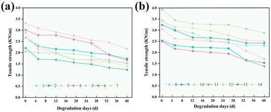 (a) Trends in tensile strength of groups 1–7; (b) Trends in tensile strength of groups 8–14.
