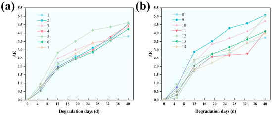 The change of in each test group during the 40 d test is shown in Figure 5. With the prolongation of degradation time, the value of 12 groups of composite fiber films increased. After 40 days of degradation, the values of the 12 groups of films were between 3.0 and 6.0. It belonged to the perceptible range of human vision, which indicated that Salix fiber composite wheat straw mulch would have an obvious color change during photodegradation. The value was an index to measure the overall color change of composite materials before and after aging. The higher the value, the more pronounced the color fading of the material.