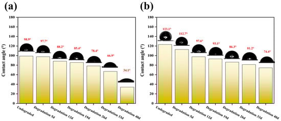 The film can be affected by natural conditions during its use such as rain and humidity. Thus, the surface layer of the mulch can collect a large amount of water. The contact angle reflects the effect of water immersion on the service life of the film [36]. For this purpose, the change in contact angle of Salix/wheat straw fiber composite films with increasing degradation time was investigated. The contact angles of the films of different test groups decreased to different degrees with the increase in degradation time. After 40 days of degradation, the contact angle of test group 5 decreased from 98.9 to 34.1 (Figure 6a), and the contact angle decreased by 65.5%. The contact angle of test group 12 decreased from 123.1 to 74.4 (Figure 6b), and the contact angle decreased by 39.6%. As the photodegradation time increases, the film surface tension decreases, the wettability increases, and the contact angle decreases. It was demonstrated that changes in the content of wet strength and sizing agent affect the change in the contact angle of the film. With increasing photodegradation time, C–C, C–O, and C–H bonds in fiber films undergo fracture hydroxyl groups that are gradually increased. Film affinity for water is reduced, and the surface tension of the film decreases. The wettability of the films increases, and the contact angle decreases [37].