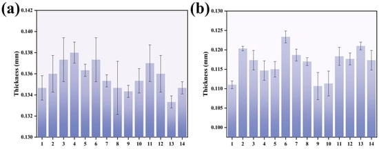 Figure 7a shows the thickness of the film when it is not degraded. Thickness is maintained at 0.134–0.137 mm. Figure 7b shows the thickness of the film after 40 d of degradation. Thickness is maintained at 0.111–0.123 mm. As can be seen from the figure, after 40 d of degradation, the thickness of all 14 groups of films decreased. However, no clear pattern of degradation was observed. This shows that photodegradation degrades the cellulose in the film, which in turn changes the film thickness. But there is no significant relationship between film thickness and degradation rate.