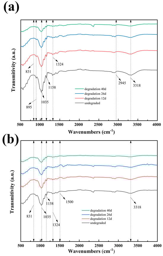 The changes in the characteristic peaks of the infrared spectrum are due to the chemical interactions that occur between the substances in the mixture. It can characterize the degradation of the film by the change in functional groups [38]. As can be seen in Figure 8, it was observed that there was no significant change in the type and location of the peaks before and after the degradation of the films. However, with longer degradation times, the characteristic absorption peaks of degraded films show a trend of decreasing intensity and broadening peak shape. The absorption peak of Salix/wheat straw fiber composite film is mainly at 895 cm−1 (–CH bending vibration), 1035 cm−1 (C–O stretching vibration), 1158 cm−1 (C–O–C anti-symmetric stretching vibration), 2931–2854 cm−1 (C–H stretching vibration), and the typical band at 3430–3410 cm−1 (O–H stretching vibration). Approximately 1429 cm−1 (CH2 symmetry bending) and peaks near 1324 cm−1 are phenol groups in cellulose [39,40,41,42] explains that the main component of the film is cellulose. With the increase in degradation time, the intensity of the characteristic peaks of the films gradually changed degradation of the toughness of the films when they are exposed to light for a long time. The main chain in the molecular structure is broken, and the relative intensity of the absorption peaks of the C–H and C–O bonds decreases with time. The degradation of the toughness of the membranes is due to a decrease in the breakage of C–O bonds eventually lead to film degradation. Sunlight could degrade cellulose substances to produce oxidized cellulose and strong organic matter. Figure 8a is the infrared spectrum of the different degradation times of the test group film 5, and Figure 8b is the infrared spectrum of the different degradation times of the test group film 12. The characteristic absorption peak of the test group 5 was stronger, and the peak shape was sharper than that of the test group 12 when it was not degraded. At 40 days of degradation, the infrared spectra of the two groups of fiber films tended to be consistent. It was further proven that the degradation rate of test group 5 was much higher than that of test group 12.
