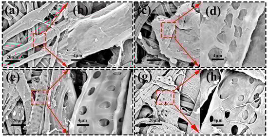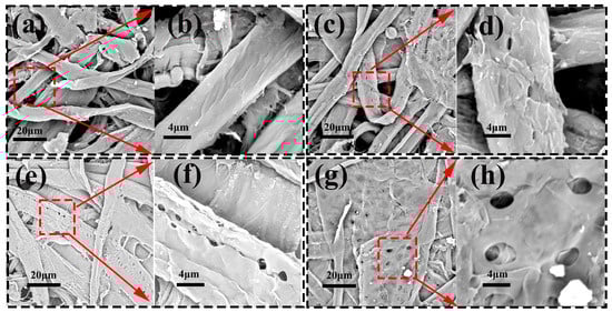 The surface of the Salix composite wheat straw fiber film was examined by SEM, and the images revealed the obvious differences in the surface morphology of the inner film in different degradation cycles. Figure 9 shows the SEM images of different degradation cycles in test group 5. The film of test group 5 showed a smooth and dense surface when it was not degraded (Figure 9a,b). The overall shape of the fiber was clear, and the fiber was obviously exposed. The surface of the Salix fiber composite straw film was uniformly coated with a dry-strength agent and a sizing agent. At the same time, a dense layer structure could be observed. This indicated a strong interaction between the modifier and the fibers. After 12 days of degradation, small pores of different shapes began to appear on the surface of the fiber film, and the pore range was not large and only appeared on a small part of the fiber (Figure 9c,d). It was seen that UV light could provide enough energy to cause fiber breakage [43]. With the increase in ultraviolet irradiation time, after 26 days of degradation, a single fiber was covered with uniform pores, and the pores were smoother than before (Figure 9e,f). After 40 d of degradation, the fibers showed large ruptures, and broken pores of varying sizes began to appear in the dense layer (Figure 9g,h). The effect of UV radiation on fiber films was seen through changes in the surface morphology of the films [44].