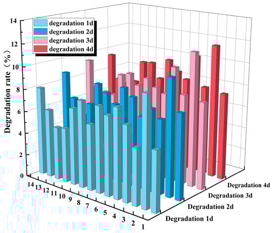 As can be seen from Figure 11, with the increase in time, the degradation of 14 groups of test group films in alkali solution increased little. At the 4th d, the degradation of the composite film began to slow down, and the degradation rate with the 3rd d was basically unchanged. The degradation rate of the 14 test group films ranged from 4.7% to 9.7% at the 1st d of degradation. After 4 d of degradation, the degradation rate of the 14 fiber films ranged from 6.8% to 11.9%. During alkali degradation, the fastest degradation was found in test group 2, with the degradation rate remaining the highest, reaching 9.65% at the 1st d and 11.89% at the 4th d. The slowest degradation was found in test group 12, with the degradation rate remaining the lowest, reaching 4.74% at 1 d and 6.90% at 4 d. Under the high-temperature conditions in the pulping process, most of the lignin had been removed and the cellulose had undergone alkaline hydrolysis [45,46]. Thus, the cellulose film was degraded by placing it in an alkaline solution, with little change in degradation with increasing time. The ratio of dry strength and sizing agents affected the degradation of fibrous films in alkaline solutions. The degradation of cellulose by alkaline solutions was also hindered to some extent.