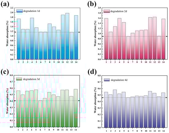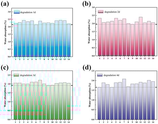 Changes in water absorption at different degradation times of group 14 films in alkaline solutions (a) degradation 1 d, (b) degradation 2 d, (c) degradation 3 d, and (d) degradation 4 d.