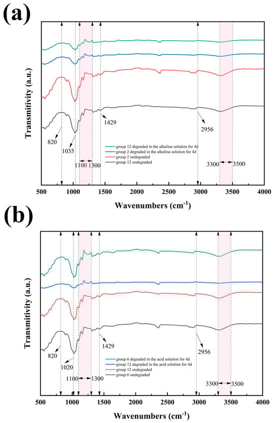 Figure 15a shows the un-degraded infrared spectra of test groups 2 (the fastest-degraded film in the alkaline solution) and 12 (the slowest-degraded film in the alkaline solution) and the infrared spectra of the test groups soaked in alkaline solution for 4 days. As revealed in Figure 15a, the intensity of the absorption peaks of the two did not change much when they were not degraded. The C–O stretching vibration peak [50,51] peak intensity at 1035 cm−1 was higher in test group 12 than in test group 2. After 4 d of degradation, the characteristic absorption peaks of the two groups of test films showed a trend of gradually weakening intensity and broadening peak shape. The peak intensity of the two groups of characteristic peaks was gradually consistent. This indicates that alkali hydrolysis occurs in a peeling reaction, where the cellulose has reducing terminal groups that fall off one by one to gradually degrade the cellulose macromolecule. The cellulose glycosidic bond oxygen atom is protonated to form a carbon-oxygen ion, leading to bond breakage. The undegraded IR spectra of test groups 6 (the slowest degraded film in acid solution) and 12 (the fastest degraded film in alkaline solution) and the IR spectra of immersion in acid and alkaline solutions for 4 d are shown in Figure 15b. According to Figure 15b, there was no obvious change in the infrared characteristic peaks of test group 6 and test group 12 when they were not degraded. After 4 d of degradation in the acid solution, the characteristic peaks of test group 6 remained essentially unchanged. It demonstrated that the acid resistance of test group 6 was better. The characteristic absorption peaks of test group 12 showed a gradual decrease in intensity and a gradual broadening of peak shape. C–H bending vibrational peak near 820 cm−1, C–O stretching vibrational peak at 1100–1300 cm−1 and CH2 bending vibrational peak at 1429 cm−1. The peaks near 1500–1212 cm−1 are C–O stretching vibration peaks [52,53], the peaks near 2956 cm−1 are methyl C–H bond stretching vibration peaks, and –OH stretching vibration peaks at 3500–3300 cm−1 [54]. Breakage of glycosidic bonds and carbon-carbon bonds between carbon atoms in the cellulose molecular chain causes degradation of cellulose. Dry strength and sizing agent dosages somewhat hinder acid attacks on cellulose.