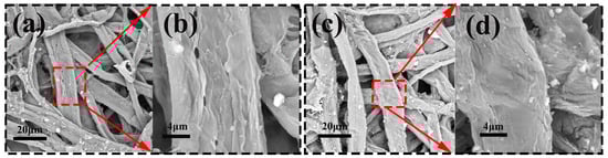 As can be seen from Figure 16, after soaking the fiber film in the alkaline solution for 4 d, white, fine particles appeared on the surface of the film as residual alkali. The film surface was not flat, and obvious cracks appeared. After immersing test group 2 in an alkali solution for 4 d, obvious pores appeared on the surface of the fiber (Figure 16a,b). Figure 16b is an enlarged, clear view of Figure 16a, indicating that the fiber film was gradually degraded in the alkali solution. Test group 12 showed the slowest degradation in the alkali solution. The large cracks on the fiber surface and larger fiber diameters (Figure 16c,d) were attributed to the swelling phenomenon of the amorphous part of the cellulose [55].