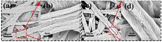 From Figure 17, it can be seen that the fiber films were immersed in the acid solution for 4 d. The overall shape of the fibers was clear. The fibers were obviously exposed, and the surface was uneven. It can be seen from the figure that although the surfaces of the two test groups showed more obvious uneven cracks (Figure 17a–d), the surface of test group 12 had deeper and longer cracks, and there was almost no bonding between the fibers. Figure c had more single fibers. The fibers were more resistant to alkali and weak to acid, and soaking in the acid solution caused large cracks in the fibers.