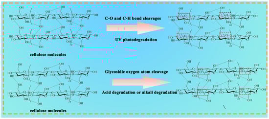 The three degradation mechanisms for the degradation of Salix/wheat straw fiber mulch are shown in Figure 18. The degradation of Salix/wheat straw fiber mulch is mainly the degradation process of cellulose. After the Salix/wheat straw fiber mulching film absorbed enough light energy from ultraviolet radiation, the C–C bond and C–H bond in the cellulose were broken, so that the Salix/wheat straw fiber mulching film was gradually degraded by ultraviolet light. The mechanism of alkaline hydrolysis is the same as that of acidic hydrolysis. In alkaline solution or alkaline solution, the peeling reaction of cellulose occurs, which protonates the oxygen atom of cellulose glycoside and forms carbon cation, resulting in bond breakage, so that the Salix/wheat straw fiber mulch is gradually degraded by acid or alkali.