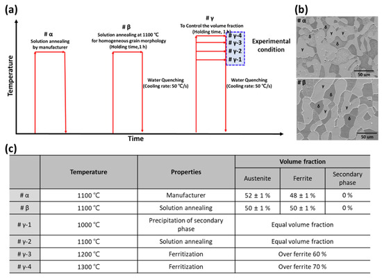 Heat treatment condition for advanced ferrite fraction on SDSS SAF 2507 (a) Schematic diagram for heat treatment of SDSS, (b) FE-SEM image of #a and #b, and (c) volume fraction with the heat-treatment condition.