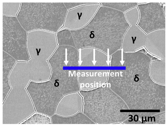 The volume fraction was measured using the FE-SEM images and analyzed using an image analyzer. To determine the volume fraction, the heat-treated SDSS samples were etched in a 5 wt% KOH electrolyte solution at a voltage of 5 V for 30 s [16,17,18,20]. The volume fraction values were calculated by analyzing five points in the images and then averaging them at 200× magnification.