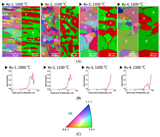 The crystal size of SDSS was observed as a function of the heat treatment temperature. As the temperature increased from 1100 °C to 1300 °C, an increase in the crystal coarsening of austenite and ferrite was observed. At 1100 °C, austenite and ferrite crystals were observed with dimensions in the 5 to 20 µm range. At 1200 °C, crystals with dimensions in the range of 5 to 40 µm were observed, and at 1300 °C, crystals with dimensions in the range of 5 to 100 µm were observed. This coarsening of crystals can be attributed to the increase in the ferrite fraction (based on microstructure) and the austenite (maximum crystal size growing from 20 µm to 40 µm). Considering the IPF color map, an increase in the heat-treatment temperature resulted in an increase in the crystal orientation of the ferrite from (001) to (111) and (101). The crystal orientation of austenite also transformed from (001) to (111) and (101) with increasing heat-treatment temperatures. Changes in volume fraction and crystal orientation were observed with varying heat-treatment temperatures.