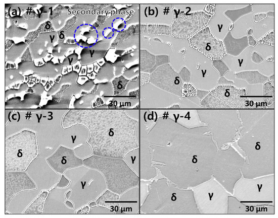 FE-SEM was utilized to scrutinize the microstructure of SDSS in relation to the heat-treatment temperature. Figure 4 and Table 2 present the microstructure and volume fraction of SDSS at varying heat-treatment temperatures. The secondary phase (Blue circles in the figure) precipitated at the grain boundary between austenite and ferrite, and at 1100 °C, it was incorporated into both ferrite and austenite. As the heat-treatment temperature escalated from 1000 °C to 1300 °C, the fraction of austenite diminished from 56% to 28%, while the fraction of ferrite amplified from 26% to 72%. The variation in the fractions of austenite and ferrite signifies the transformation of the secondary phase, which gets incorporated into ferrite with increasing temperature. The phase transfer in SDSS with temperature is attributed to the stabilization of delta ferrite in Fe, primarily due to high levels of alloying elements such as Cr and Mo. Consequently, at temperatures exceeding 1100 °C, an augmentation in the fraction of ferrite occurs while the fraction of austenite decreases.
