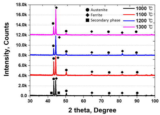 The heat-treatment temperature of SDSS is an essential factor in controlling its properties because it affects the fraction of ferrite and austenite [16,19]. The microstructure of the SDSS with respect to the heat-treatment temperature is shown in Figure 3. As the heat-treatment temperature increased, austenite underwent a transformation, and its volume fraction decreased. In contrast, ferrite, which is the base structure, gradually increased from 1100 °C to 1300 °C. At 1000 °C, a secondary phase precipitated, but it was distinguished as ferrite using EBSD analysis.