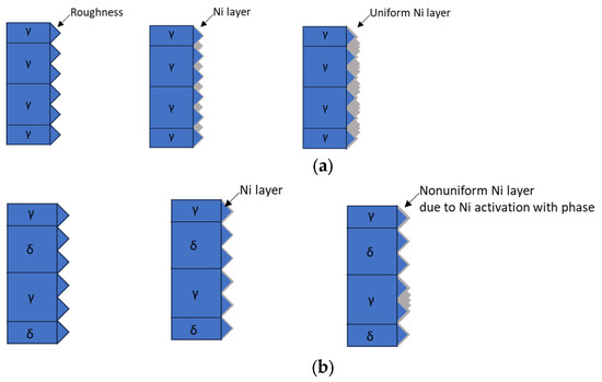 The SDSS was subjected to electroless Ni plating after heat treatment, and the results are shown in Figure 6. Upon observing the surface images, it became apparent that the difference in reactivity between austenite and ferrite made it easier to distinguish them after electroless Ni plating. The electroless Ni plating behavior of Stainless Steel 304 (γ, single phase) and SDSS is illustrated in Ni plating behavior in Figure 7 [27,29]. During the electroless Ni plating process, there were differences in behavior owing to variations in the reactivity between the single-phase stainless steel and DSS. Electroless Ni plating initially reduced the surface roughness at the grain boundaries for single-phase materials. After plating, a uniform Ni layer was formed, reducing the surface defects caused by grain boundaries. In contrast, duplex materials exhibit preferential reactions at the grain boundaries of more reactive phases. The difference in reactivity between austenite and ferrite makes it easier to distinguish between these phases. The variations in the crystal structures of austenite and ferrite in electroless Ni plating are attributed to differences in Ni reactivity. The secondary phase was indistinguishable after plating. During electroless Ni plating, the secondary phase facilitated Ni diffusion owing to the differences in surface roughness. After plating, the secondary phase resembled ferrite and austenite.