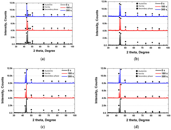 XRD pattern of SDSS with Ni plating time after heat treatment at (a) 1000 °C, (b) 1100 °C, (c) 1200 °C, and (d) 1300 °C.