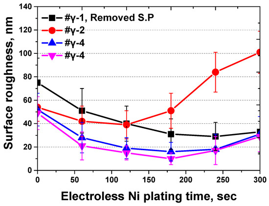 The initial decrease in roughness was ascribed to a reduction in surface indentation, while the increase in roughness was influenced by the differences in reactivity between the austenite and ferrite phases. In instances where secondary phases were present, the slower decrease in roughness was attributed to the substantial differences in reactivity and roughness between these secondary phases and austenite. Conversely, in the absence of secondary phases, the plating rate is primarily determined using the reactivity between austenite and ferrite. An increase in the ferrite fraction resulted in a decreased plating rate due to the lower reactivity of ferrite. Therefore, the phase fraction of SDSS significantly impacted the electroless Ni plating process.