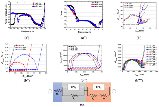 EIS results of SDSS with Ni plating time after heat treatment (a′) Frequency vs. Angle of phase, Bode plot, (a″) Frequency vs. Resistance, Bede plot (b′) Nyquist plot of Rs, (b″) Nyquist plot of R1, (b‴) Nyquist plot of R2, (b⁗) EIS circuit, (c) Nyquist plot with electroless Ni plating condition.