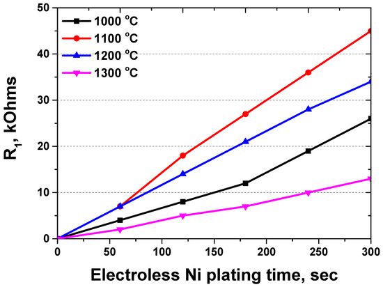The ferrite and austenite fractions also influenced the Ni plating performance. An increase in the ferrite fraction from 50% to 73% reduced the resistance (R1) of the plating layer from 45 kOhms to 13 kOhms at 300 s. Subsequently, the resistance of the passivation layer (R2) remained constant. The resistance of the plating layer increased proportionally with electroless Ni plating time, and the volume fraction was a limiting factor depending on the desired outcome [33,42,43].