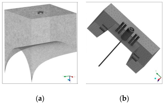 The flow field and the electrostatic field are solved using finite volume methods of ANSYS19.0/Fluent software. A hybrid unstructured mesh with 1,400,000 cells is used in the computational domain, a high-density mesh is close to the electrode needle and all holes in the region where the higher flow gradients and higher droplet concentrations are resolved properly. The computational domain and electrostatic air sprayer cap mesh distribution are shown in Figure 2.