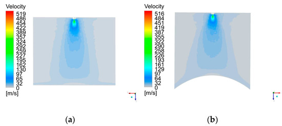 The main forces that determine the transport of the paint droplets are the electrostatic force and the drag force, with gravity being a minor contribution in the domain. The air velocity flow fields through the XOZ plane for different targets are shown in Figure 3.