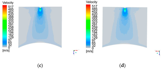 Air velocity contours for different conical targets: (a) k1 = 0; (b) k1 = 4. 78 × 10−3; (c) k1 = 3.29 × 10−3; (d) k1 = 2.28 × 10−3.