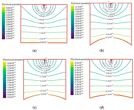 The intensity of the electric field is inversely proportional to the separation distance between the potential lines. As shown in Figure 4, regions with high electric strength exist in the vicinity of the electrode needle, where the aerodynamic force also plays an important role. The electrical potential near the targets with different curvatures is different. In Figure 4a, the equipotential lines close to the sprayer and to the electrode tend to follow the outline of the geometry, and, away from the sprayer surface, the lines become more spherical in shape, resembling the solution of the electrostatic field for targets with different curvatures, as shown in Figure 4b–d. This result is consistent with that obtained by Viti [14] in an electrostatic rotary bell spray-painting process; the equipotential lines close to the sprayer in this research are long and elliptical, which for Viti [14] are cup-shaped, due to different discharge of the spray gun. When approaching the target surface, the potential field tends to follow the target outline to meet the condition of 0 V on the target. The potential curve coaxially near the sprayer is denser than that away from the coaxial, and the density increases with increasing cone curvature, indicating that the electrostatic field intensities at these locations are higher than those coaxially away from the sprayer.