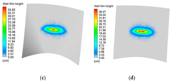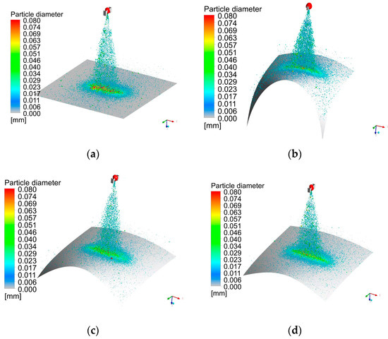 Figure 5 shows that larger paint droplets, due to their high inertia, are less affected by the shaping airflow. As a result, they tend to concentrate towards the center of the spray cone. On the other hand, the smaller droplets are easily influenced by the airflow and deviate from the spray cone, spreading outwards. Therefore, the bigger and medium-sized droplets adhere effectively to the target surface. This result is in agreement with that obtained by Chen et al. [9] in an air spray-painting process. The droplets outside the spray cone tend to escape the shaping air and form an elliptical disk around the sprayer; the lengths of the long shaft and short shaft of the ellipse are determined by the momentum of the droplets. Figure 5a shows that when the target is in the plane, larger particles adhere to the center of the paint film. In Figure 5b, the sprayed surface has the highest curvature, while there are the fewest large and medium-sized droplets deposited on the surface. Figure 5c shows that more large and medium-sized droplets compared to Figure 5b are deposited on the sprayed surface with the second highest curvature, In Figure 5d, the sprayed surface has the lowest curvature, but there are still more large and medium-sized droplets compared to Figure 5c, second only to deposition on the plane shown in Figure 5a. Figure 5 shows that more particles spread along the curved direction near the conical surface, and the number of larger particles adhering to the center gradually decreases as the curvature of the conical target increases.