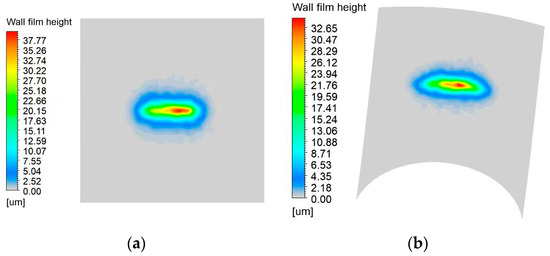 The simulated film thickness distributions are drawn in body-fitted coordinates along the X- and Y-axes of elliptical film deposition. The film thickness along the X-axis is almost symmetrical about the center point, except on the plane target and offset along the Y-axis, where these offsets appear to result from the lateral airflow in the experiment. Figure 10a,b show that the film thicknesses of different target surfaces along the X-axis are almost higher than those along the Y-axis. These simulated film thickness distributions are always slightly higher than the experimental values. The difference may be due to measurement errors. The film thickness of the plane is higher than that of the curved surface, and the thickness decreases as the target surface’s curvature increases whether it is in experiment or simulation. This result is in agreement with that obtained by Chen et al. [9] in an air spray-painting spherical surface process, whereas the film thickness for electrostatic air spray painting is higher than that for air spray painting due to the electric field between the sprayer and the target.