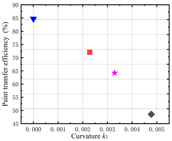 The paint transfer efficiency is relatively high for the planar target and decreases as the conical target’s curvature increases. Due to the curved characteristics of the cone surface along the radial direction, the velocity along this direction increases in the flow field near the wall. Some relatively small droplets can easily overcome the electric field force, paint viscidity, and surface tension to splash. As a result, the droplets diffuse so largely that the effective film-forming range is small, and the paint transfer efficiency decreases along with increasing cone curvature. When the principal curvatures of the center point of the target’s paint film are k1 = 0, 2.28 × 10−3, 3.29 × 10−3, and 4. 78 × 10−3, the paint transfer efficiencies are 84.69%, 69.04%, 64.19%, and 48.53%, respectively.
