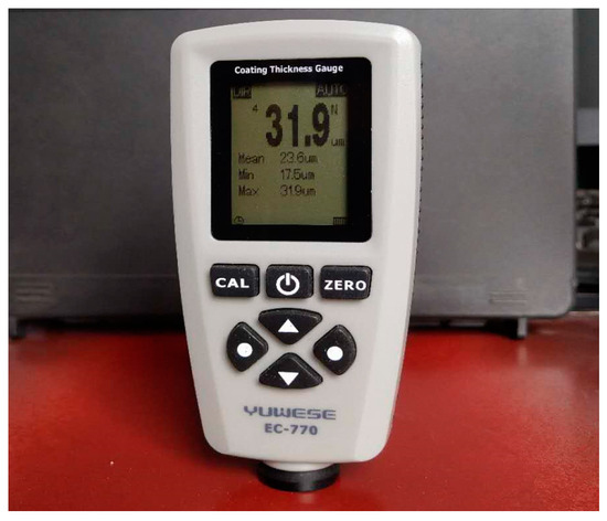 After the paint film was solidified, the thickness was measured using a film thickness gauge along the long and short axes of the film distribution at an interval of 10 mm. The YUWESE EC-770 coating thickness gauge, shown in Figure 9, was utilized in the experiment to quantify the thickness of the coating. The precision of the gauge was 1 μm within a range of 0–999 μm. The film thickness at each point was measured five times, and the average was used as the final thickness value. Figure 10 shows the comparison between the measured and simulated film thicknesses.