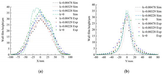 Film thickness distributions for different conical surfaces: (a) film thickness along the X-axis; (b) film thickness along the Y-axis.