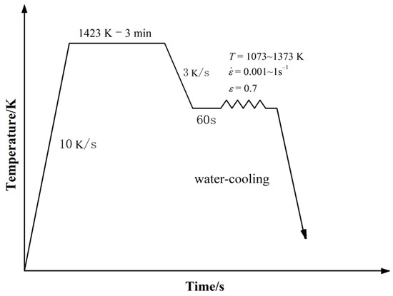 The ingot was processed into a cylinder with 8 mm in diameter and 10 mm in height for hot-compression experiments. Single-pass compression tests were carried out using the Gleeble-3800 thermomechanical simulator (DSI, Albany, NY, USA). The schematic diagram of the hot-compression experiment is shown in Figure 1. The specimens were heated to 1423 K at a rate of 10 K∙s−1 and held for 3 min to eliminate the internal temperature gradient, and cooled to deformation temperature at a rate of 3 K∙s−1. The deformation temperature was set as 1073 K, 1173 K, 1273 K or 1373 K. The strain rate was set as 0.001 s−1, 0.01 s−1, 0.1 s−1 or 1 s−1; the total deformation is 70%. When the temperature was reached, the specimens were held for 30 s, and then single-pass compressing tests were carried out and repeated for all the experiments under different temperature. The crystal structure of the sample was tested using an XRD-6100 Lab X-ray diffraction analyzer (SHIMADZU, Kyoto, Japan) with CuK α Ray, λ = 0.15406 nm. The working current is 30 mA, working voltage is 40 kV, scanning angle range is 20–90°, and scanning speed is 2 (°)/min. The microstructure of AlCoCrFeNiTi0.5 HEA is analyzed using the OLYMPUS BX51M optical microscope (OM, Olympus Corporation, Tokyo, Japan) after electropolishing with 4% fluoroboric acid.